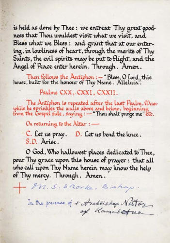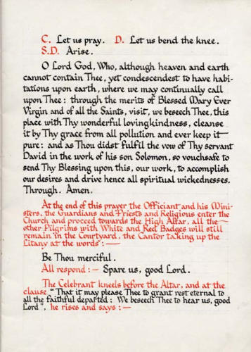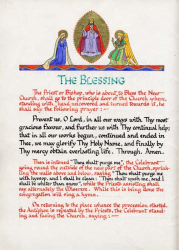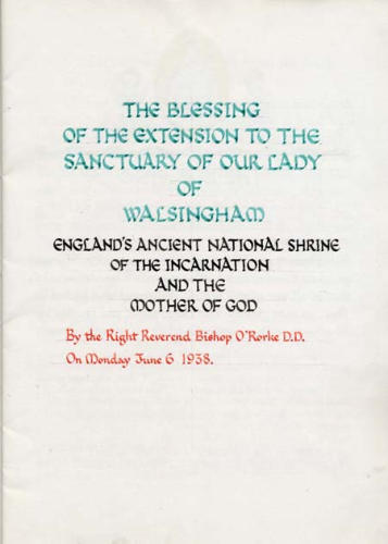 Enid Chadwick created this Order of Service for the Blessing of the new Shrine Church on6 June 1938. In the procession this book was carried by Fr Patten,walking in front of Bishop O’Rorke.The book was also used later to add the Order of Service for the Blessing of the newComper Reredos for the Holy House in 1959.