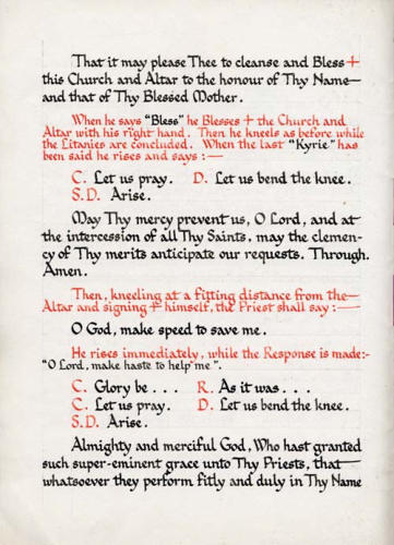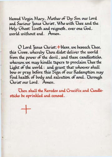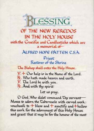 The next two pages in the book (below) were created for the Blessing of the new Comper Reredos in the Holy House in 1959. This Reredos had been commissioned to commemorate the 900th anniversary of the Shrine, and became a memorial to Fr Patten, who died in 1958. The crucifix and candlesticks were also given as a memorial to him.